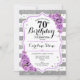 Convite de aniversário de 70. Design de lavanda de branca prateada elegante com falso brilho. Listras prateadas e brancas com rosas roxas. Perfeito para uma elegante festa de aniversário 70.