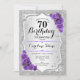 Convite de aniversário de 70. Design floral elegante em prata e roxo. Apresenta faixas de prata com brilho sujo, fontes de script na moda de rosa de de roxo e confetti. Perfeito para uma festa de aniversário de vidro.