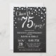 Convite de Aniversário de Casamento de 75 anos Quadro-negro Preto e Prata. Setenta e cinco anos de Casamento. Fundo de Diamante Brilhante Preto e Prata. Confetes Prateados. Aniversário de Adulto. Festa de Aniversário de Homem ou Mulher. Para personalização adicional, clique no botão "Personalizar" e use nossa ferramenta de design para modificar este modelo.