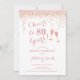Convite de aniversário de 80. Saúde Para 80 Anos! Design elegante em branco e rosa. Apresenta óculos de champanhe, fonte de script e confetti. Perfeito para uma festa de aniversário na moda oitenta. Personalize com seus próprios detalhes. Pode ser personalizado para mostrar qualquer idade.