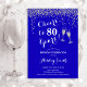 Convite de aniversário de 80. Saúde Para 80 Anos! Design elegante em azul real, branco e prata. Apresenta óculos de champanhe, fonte de script e confetti. Perfeito para uma festa de aniversário na moda oitenta. Personalize com seus próprios detalhes. Pode ser personalizado para mostrar qualquer idade.