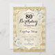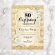 Convite de aniversário de 80. Design floral elegante em ouro e branco. Apresenta fitas de ouro com brilho sujo, fontes de na moda de rosas brancas e confetti. Perfeito para uma festa de aniversário de vidro.
