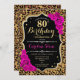 Convite de aniversário de 80. Elegante design cor-de-rosa e preto branco com ouro brilhante falso. Apresenta impressão de animais leopardo cheetah, fonte de script e rosas rosa-quente. Perfeito para uma bolsa mensageifesta de aniversario elegante. Pode ser personalizado em qualquer ano! Envie-me uma mensagem se precisar de mais personalização.
