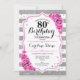 Convite de aniversário de 80. Design cor-de-rosa branco prateado elegante com brilho sujo. Listras prateadas e brancas com rosas cor-de-rosa. Perfeito para uma elegante festa de aniversário oitenta.