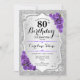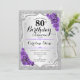Convite de aniversário de 80. Design floral elegante em prata e roxo. Apresenta faixas de prata com brilho sujo, fontes de script na moda de rosa de de roxo e confetti. Perfeito para uma festa de aniversário de vidro.
