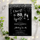 Convite de aniversário de 80. Saúde Para 80 Anos! Design elegante em preto, branco e prata. Apresenta óculos de champanhe, fonte de script e confetti. Perfeito para uma festa de aniversário na moda oitenta. Personalize com seus próprios detalhes. Pode ser personalizado para mostrar qualquer idade.