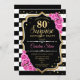 Surpresa 80 de Aniversário. Design branco, preto feminino, cor-de-rosa com ouro brilhante falso. Apresenta faixas pretas e brancas, rosas cor-de-rosa, fontes de script e confetti. Perfeito para uma bolsa mensageifesta de aniversario elegante. Pode ser personalizado para mostrar qualquer idade. Envie-me uma mensagem se precisar de mais personalização.