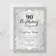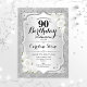 Convite de aniversário de 90. Design elegante em prata e branco. Apresenta fitas cintilantes de prata, fontes de na moda de rosas brancas e confetti. Perfeito para uma festa de aniversário de vidro.