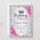 Convite de aniversário de 90. Design elegante em prata e rosa. Possui riscas prateadas com brilho sujo, fonte de script na moda de rosas rosa e confetti. Perfeito para uma festa de aniversário de vidro.
