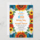 Design floral elegante e colorido para um evento de queda no quintal. Apresenta rosas azuis, margaridas brancas, flores silvestres vermelhas e girassóis