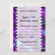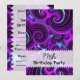 Convites de aniversário com um estilo hippie funky espirram um padrão de arte fractal em diferentes tons de roxo.