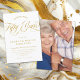 Convite de jantar de aniversário de bodas de ouro em branco com letras douradas. Convite de aniversário de 50 anos de casamento com letras douradas em fundo branco. Cinquenta Anos em uma letra dourada swirly. Adicione uma foto do casal feliz celebrando seu aniversário de 50 anos de casamento no verso do convite branco e dourado. Todos os detalhes dourados são de uma cor bege dourado apenas e não folha de ouro.