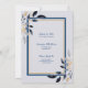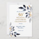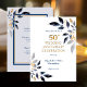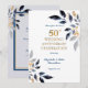 Um convite de cartão dourado para Bodas de Ouro de 50 anos. Reúna amigos e familiares para homenagear um casal especial no seu 50º aniversário de casamento. Este convite de festa de aniversário de 50 anos é dourado e projetado com texto em azul-marinho e folhas. O texto inclui: Celebração do 50º Aniversário de Casamento, Homenageando, Nomes do Casal e Data do Evento. O texto no verso inclui: Data, Hora, Local e Detalhes de RSVP. Para personalizar, basta inserir seus detalhes em nosso modelo fácil, substituindo o texto de exemplo. Nota: este convite tem uma faixa retrátil de aniversário de 50 anos disponível para combinar.