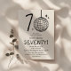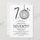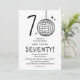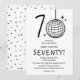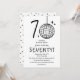 Faça 70 anos com estilo com nossos convites de aniversário de 70 anos modernos e elegantes. Nosso design apresenta uma bola de discoteca desenhada à mão única formando o '0' no número 70, estrelas retrô espalhadas e um modelo de festa casual em uma fonte manuscrita emocionante, tudo em um fundo branco atemporal. Este convite especial une diversão e elegância, um verdadeiro reflexo do que é fazer 70 anos.