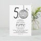 Faça 50 anos com estrondo com nossos convites de 50º aniversário modernos e elegantes. Nosso design apresenta uma bola de discoteca desenhada à mão única formando o '0' no número 50, estrelas retrô espalhadas e um modelo de festa casual em uma fonte manuscrita emocionante, tudo em um fundo branco atemporal. Este convite especial une diversão e elegância, um verdadeiro reflexo do que é fazer 50 anos.