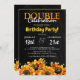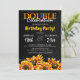 Uma dupla celebração significa o dobro da diversão. Estes convites de aniversário de captação de olhos, apresentam um fundo de quadro comum rústico, luzes de fadas de cordas para elegância e girassóis lindos para decoração. Os detalhes do evento são facilmente personalizáveis e cores, tamanho e fontes também podem ser alterados para sua especificação.