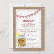Um convite de aniversário com uma ilustração de um copo de chá doce com limão no fundo esquerdo. O gingham vermelho no topo. O fundo é inspirado em burlap.