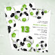 Este convite de festas de tema de futebol bonito apresenta clusters de bolas de futebol brancas, verdes, pretas e brancas brilhantes nas bordas superior e inferior na frente e um cluster de solteiros que cobre a parte posterior do convite - personalize os detalhes da festa em um fundo branco - por katz_d_zynes
