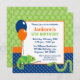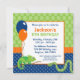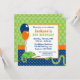 Crianças bonitas repicam convites de festas de aniversários. Design apresenta balões de festa, camaleão e cobra, com sotaque de bolinhas. Combinação de cor tradicional de verde, azul e laranja. Gráficos por www.jwillustrations.com