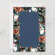 Convite de aniversário de Halloween com uma moldura assustadora de Halloween com abóboras, gatos, fantasmas, crânios, ferramentas, morcegos e folhas de outono sobre um fundo azul escuro.