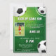 Convite para Aniversário de criança de futebol de futebol. O design tem uma mensagem divertida de "Arranje alguma diversão" e bolas de futebol em um fundo verde. Personalize com suas informações.