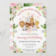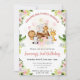 Bons animais da selva de aquarelas design com leão, elefante, tigre e girafa, folhagem tropical verde e flores rosa e brancas.