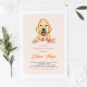 Convite para Aniversário de criança Floral Peach para Retriever de Ouro Cujo É Cortado | Convide familiares e amigos para sua festa de aniversário com este convite floral personalizável. Apresenta ilustrações de aquarela de um recuperador de ouros e flores de pêssego. Este será o convite perfeito para amantes de cães.