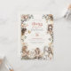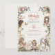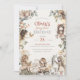 Convites de primeiro aniversário de fada caprichosa com fadas de jardim em aquarela e tema de fantasia floral criam uma aparência mágica e encantadora perfeita para celebrar o primeiro aniversário de uma menina. Este convite de aniversário lindamente ilustrado apresenta delicadas fadas em aquarela cercadas por verdejante suave, flora em flor e elementos encantadores inspirados na natureza que trazem um sentimento de conto de fadas sonhador ao design. Cada ilustração de fada adiciona um senso de maravilha e movimento suave, criando uma cena de jardim caprichosa que se sente ao mesmo tempo lúdica e elegante. A paleta de cores pastéis suaves com tons rosados, verdes suaves e neutros quentes aprimora a estética de conto de fadas, mantendo o design geral leve, arejado e sofisticado. A tipografia de roteiro elegante combinada com letras serifadas clássicas cria um layout equilibrado que destaca a mensagem de aniversário, mantendo uma aparência polida e graciosa. Os acentos florais e detalhes folhosos enquadram o design naturalmente, adicionando profundidade e interesse visual sem sobrecarregar a composição limpa. Perfeito para uma festa de primeiro aniversário com tema de fada, celebração de jardim encantado, aniversário de menina caprichosa ou evento inspirado em conto de fadas, este design combina arte em aquarela delicada com elegância atemporal. A combinação de flora suave,