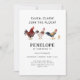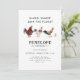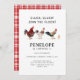 Cartão de convite de aniversário de criança com tema de fazenda bonito, com ilustração aquosa de galinhas e pintinho. O texto diz: "Pé, pega! Junte-se ao bando!"