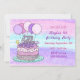 Convites de aniversário de menina com bolo e balões desenhados à mão roxo e rosa