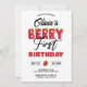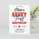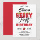 Celebre o primeiro aniversário de um pequeno com este adorável convite temático de morango! Com letras de morango fofas que escrevem "Berry First" e uma ilustração de um moranguinho doce, este convite é perfeito para uma festa de verão.