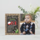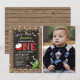 Convites de aniversário com tema de pesca para celebrar o primeiro aniversário do seu filho! Este convite apresenta um fundo de madeira rústica, uma foto da criança, uma peça central de quadro-negro, um peixe verde fofo, uma bóia de pesca e um modelo de celebração de aniversário moderno e fácil de personalizar.