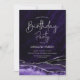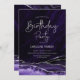 Convite de aniversário de agata roxo e prateado. Elegante design moderno com aquarela agate marble geode background, faux glitter prata e tipografia. Trendy convida o cartão perfeito para uma comemoração de dia das mulheres na moda. Impressos convites Zazzle ou modelo de impressão digital instantânea para download.