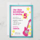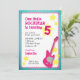 O convite para o aniversário desta garota fofa tem um tema de estrela do foguete. O fundo apresenta um grunge teal e é acentuado com uma guitarra rosa brilhante e estrelas amarelas. O texto personalizável permite adicionar todos os detalhes da parte. Este convite é apresentado para um quinto aniversário, mas pode ser personalizado para qualquer idade.