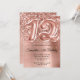 Crie seu próprio falso convite para comemoração de rosa de ouro e 12 de folha de papel para sua filha. O plano de fundo apresenta um gráfico de arte digital, cor-de-rosa-esbranquiçada e ouro-rosa, com um falso balão de arte nº 12. Personalize as cores ou estilos da fonte do convite. Os faíscas de luxo, brilho e folha serão criados com elementos artísticos criativos que impressão nos convida como uma foto.