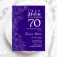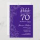 Convite de Aniversário para 70 de Surpresa Roxa. A design feminina moderna minimalista apresenta sotaques botânicos e letra de script de tipografia. Simples cartão de convite floral perfeito para uma festa surpresa na moda. Impressos convites Zazzle ou modelo de impressão digital instantânea para download.