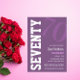 Aproveite a elegância e comemore sete décadas de vida com o nosso Convite de Aniversário para 70 de Bico Moderno! Apresentando um design elegante e sofisticado com um toque de roxo regal, este convite dá o tom perfeito para uma celebração de na moda. Personalize com seus detalhes de evento um toque personalizado que reflita seu estilo exclusivo.