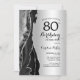 Convite de aniversário 80 preto e prateado. Elegante design moderno com fundo geode de pedra de pedra marmortal, letra falsa prata brilhante e script de tipografia. Trendy convida o cartão perfeito para uma comemoração de dia das mulheres na moda. Impressos convites Zazzle ou modelo de impressão digital instantânea para download.