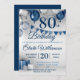 Um design de na moda para uma comemoração de 80. Possui balões azuis e prateados e pennant com texto azul.