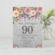 90 de Aniversário do Silver Glitter Floral Surprise Invitation para Mulheres. Flor Floral de Aquarela. Fundo da Glitter de Prata. Rosa, Amarelo, Laranja, Flor Roxo. Aniversário Adulto. 13 15 16º 18º 20 21rua 30 40º 50º 60º 80 de 70 100º, qualquer idade. Para mais personalização, clique no botão "Personalizar" e use nossa ferramenta de design para modificar este modelo.