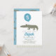 Este convite de aniversário bonito de "chomp! chomp! chomp!" de criança/menino apresenta um crocodilo/jacaré com um balão azul. O verso apresenta um fundo azul com padrões de crocodilo/crocodilo. Personalize para suas necessidades. Você pode encontrar produtos correspondentes na minha loja.