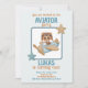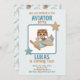 Adorável convite para uma festa de Bear Bear Aviator, com ursos bonitos voando num avião. O convite é personalizável e personalizado - você pode alterar o nome, a data, o endereço e outro texto neste design. Tons de cor da água azul e bronzeada.