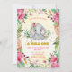 Um adorável elefante bebê com flores delicadas acima da cabeça. Atrás do bebê, você vê corações ouros brilhantes. Um convite para comemorar o doce aniversário de sua garota.