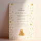 Adicione um toque doce e acolhedor à sua celebração de bebês com este adorável fundo de convite de urso de mel. Apresentando uma ilustração aquosa de cor macia de um bebê urso segurando um pote de mel, rodeado por flores silvestres amarelas e abelhas buzinas. Esta design suave e neutra é ideal para chás de fraldas, convites para o primeiro aniversário, posters de marcos bebês, ou decoração de berçários. Uma escolha perfeita para temas de bebês inspirados na natureza ou na primavera. Excelente para uso impresso ou digital.