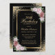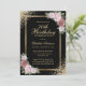 Convite de aniversário floral, preto e dourado, elegante, com flores rosas e cor-de-rosa pinceladas e verde, definindo os detalhes da festa de aniversário, um quadro de ouro enfeitado com confete de ouro. Enche o convite de aniversário floral. Concurso de aniversário de Blush e ouro. Convite de aniversário rosa e dourado. Convite de aniversário rosa. Convite de aniversário floral preto e ouro. Personalize facilmente esta modelo a qualquer festa de aniversário.