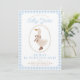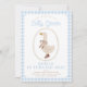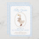 Um convite de aniversário de gingham azul bonito com um ganso em botas.
