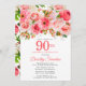 Rosas, peonias e margaridas criam o design floral rosa-rosa bonito de verão. Os botões e a folhagem adicionam uma vibração rústica. 90 é escrito em um texto grande e em negrito. Pode ser mudado para qualquer ano que você quiser. O nome do celebrante de aniversário é escrito em uma fonte elegante. A parte de trás do convite é um padrão floral branco e cor-de-rosa.