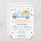Este convite apresenta folhas de outono bonitas e um caminhão azul cheio de feno e abóboras.