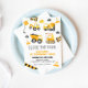Festa de aniversário de caminhão de construção com caminhão de lixo, guindaste, sinais de cautela e cones de laranja.