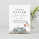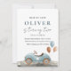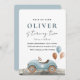 Comece seu dia especial em estilo com este adorável convite de aniversário de aquarela com um carro de brinquedo azul vintage com balões flutuantes. Perfeito para uma segunda comemoração de aniversário, os tons de pastel suave e o layout mínimo fazem com que este convite seja eterno e encantador. Personalize facilmente todo o texto para corresponder ao seu evento. Ideal para a festa de aniversário de um bebê, especialmente as idades 1 a 3.